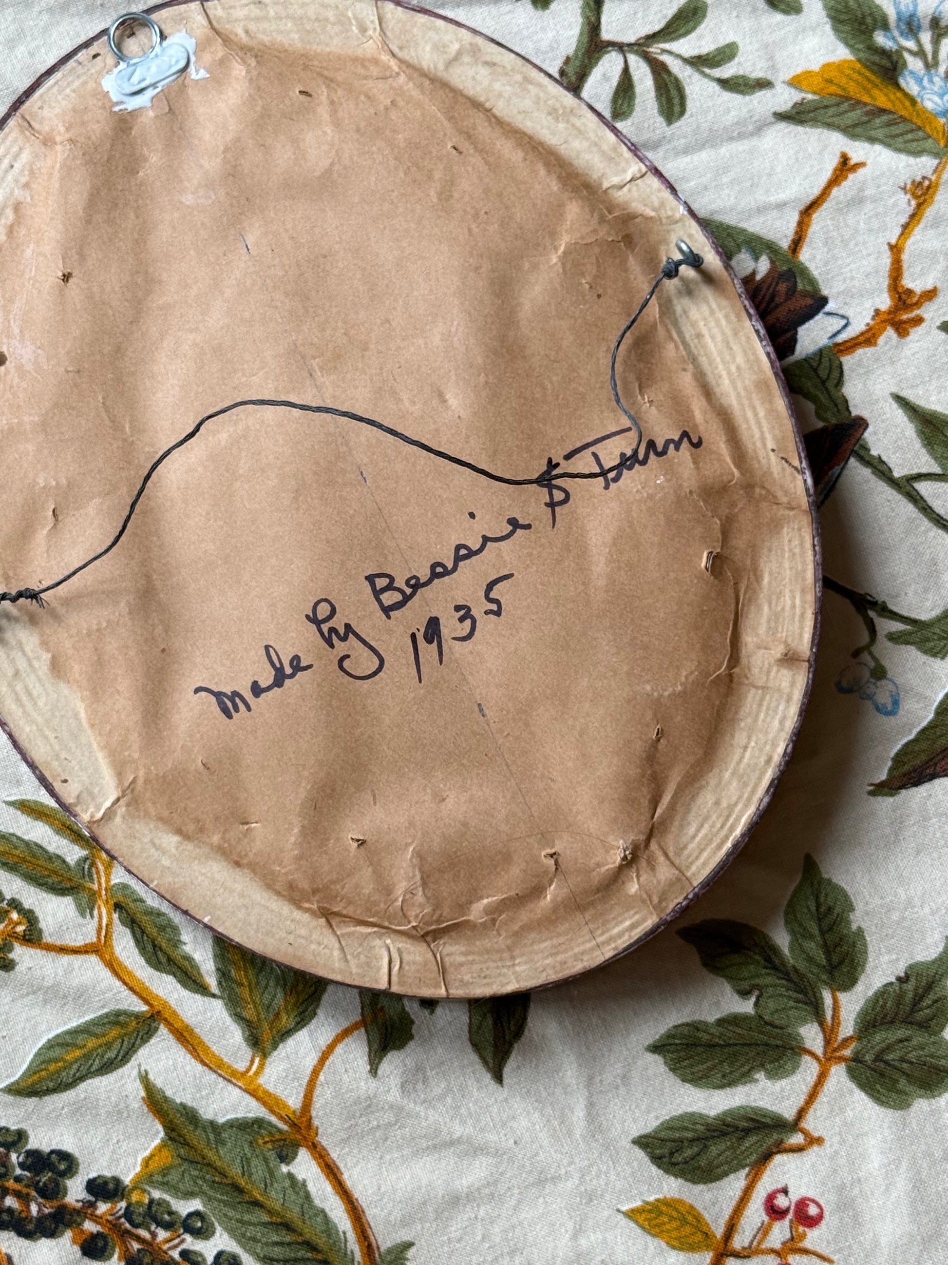 These nearly-antique needlepoints bring a winning combination of soft and muted alongside bright and vibrant. One-of-a-kind artworks like this offer a glimpse into the domestic arts of the early 20th century. Both needlepoints are housed in their original, complementary burgundy and gold oval frames. The reverse of each frame bears a signature and date, 1935. Sourced in Ridgefield, CT.