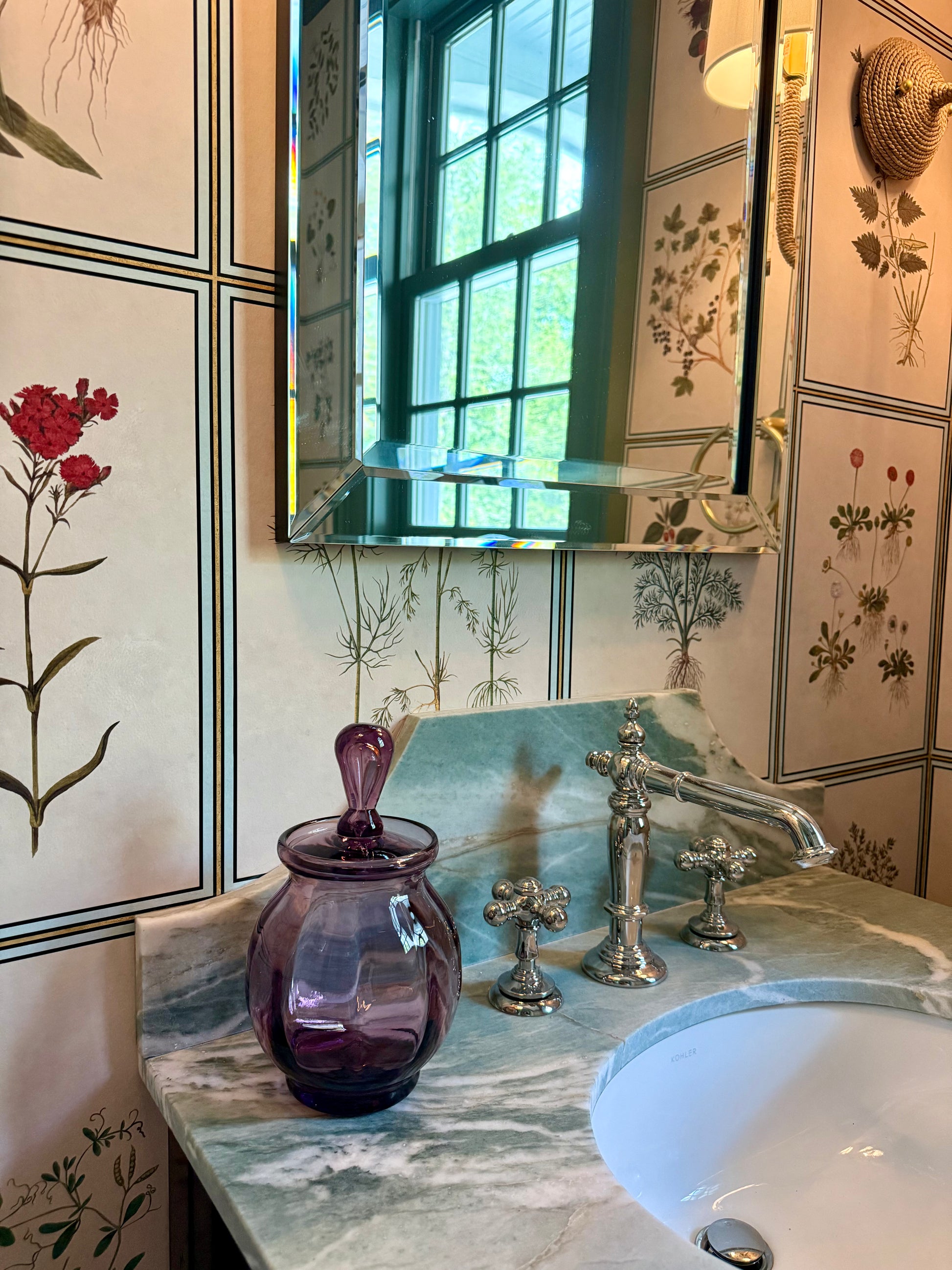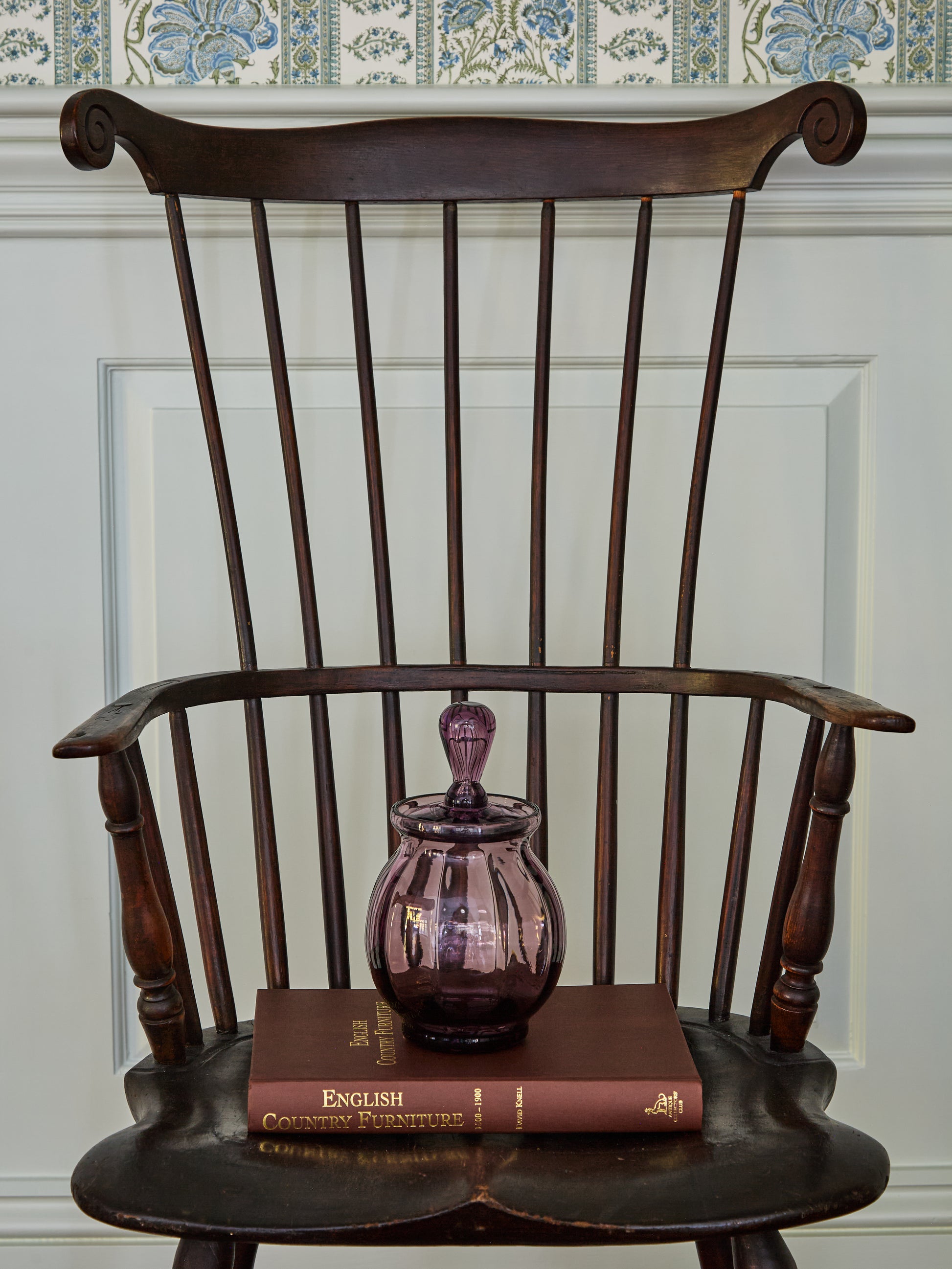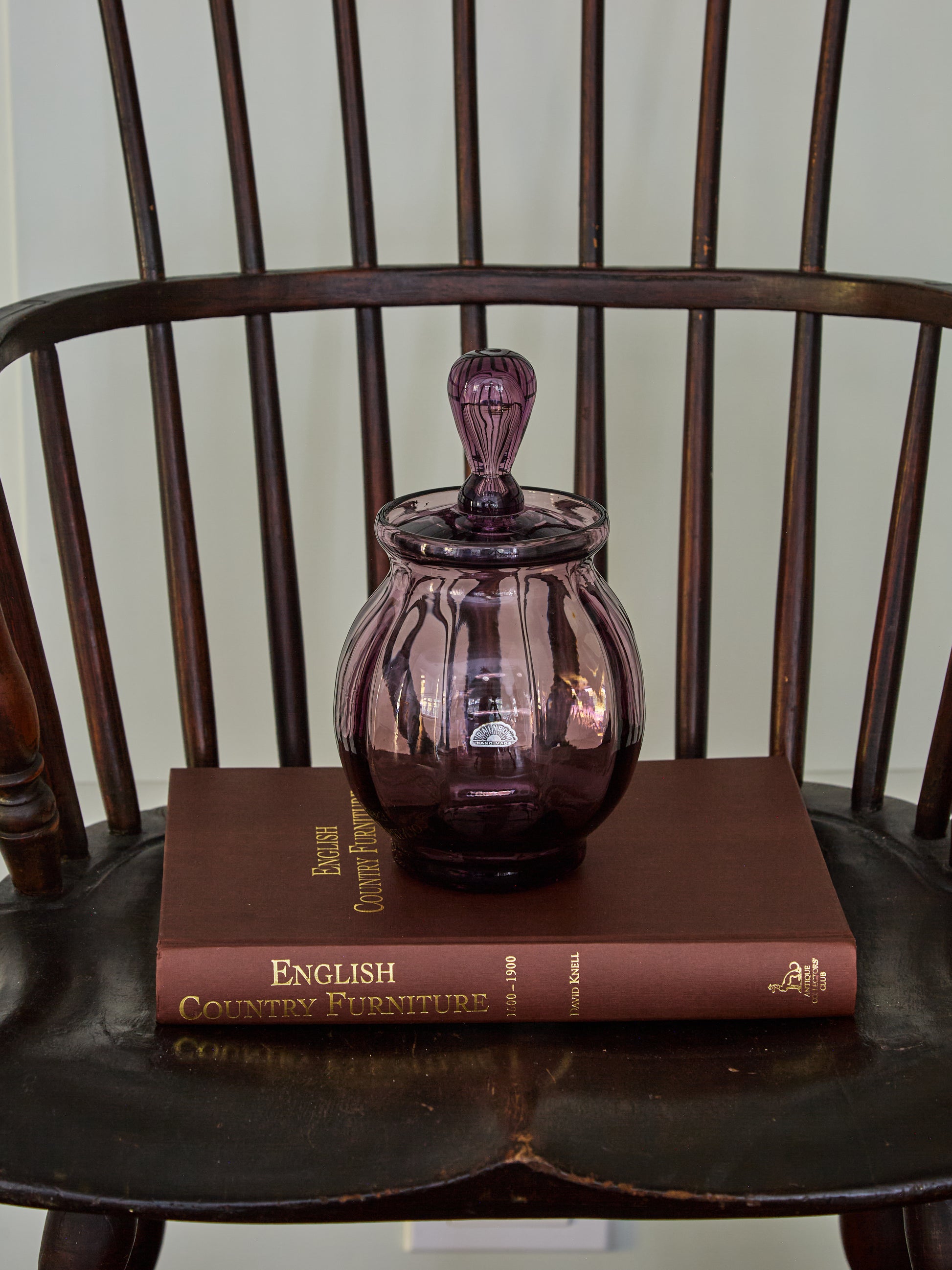 Rainbow Glass was founded in 1940 and became known for its vibrant, hand-blown glassware that celebrated color and craftsmanship. This amethyst gem, crafted in the 1960s by artisans in Italy, is a standout piece in both form and hue. A portion of its original “Rainbow Handmade” foil label remains on its backside. The vessel is ideal as a decorative accent, vanity jar or candy jar!