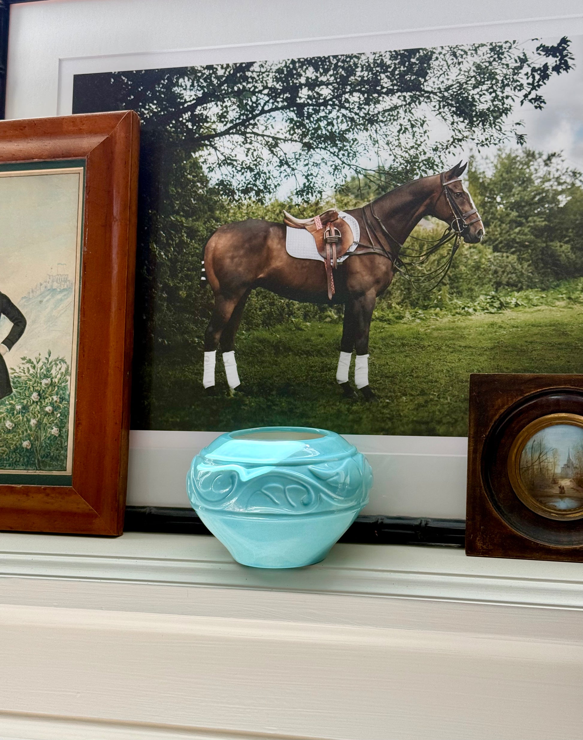 This studio pottery piece from 1973 is an excellent example of thoughtful design. It features a vibrant aegean turquoise glaze that accentuates its form. The vase expertly marries the timeless curves of Art Nouveau with a subtle hint of midcentury design, resulting in a wonderfully unique work of art. Sourced in Concord, Massachusetts.