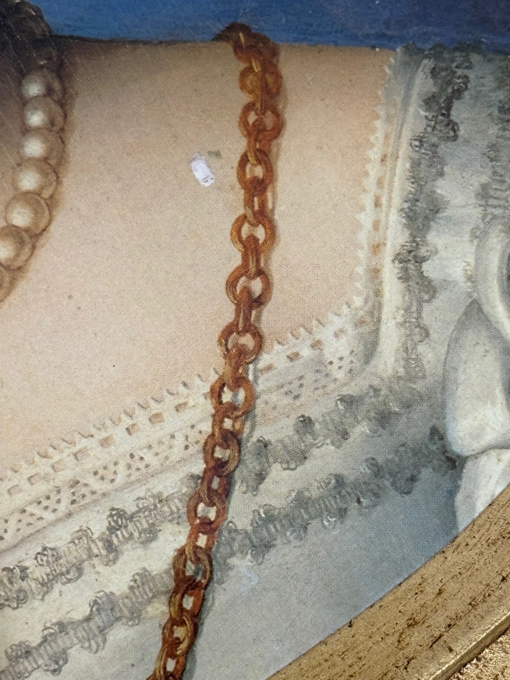 The center of the tray features a reproduction of Agnolo Bronzino’s famous 1551 portrait of Maria de' Medici, daughter of the Grand Duke of Tuscany. Known for her regal expression and exquisite pearl jewelry, Maria’s portrait brings an air of aristocratic history to any tabletop.