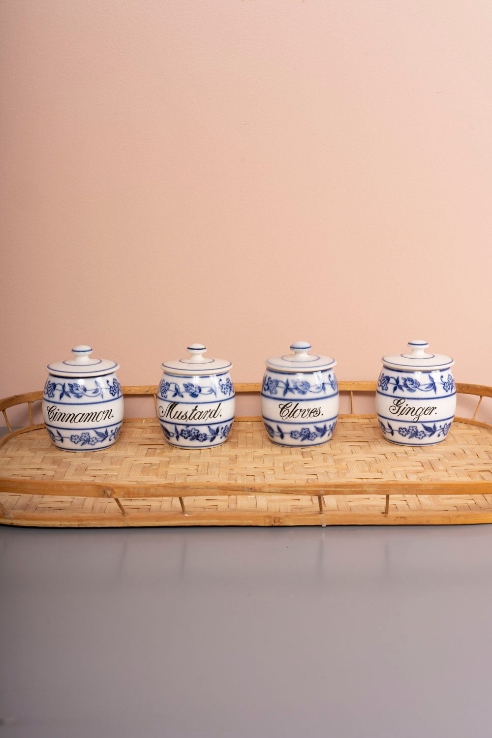 Spice up your kitchen staples with late-19th century blue onion (Zwiebelmuster) canisters. They're perfect for your spice collection, but also for loose leaf tea as well. The script is one-sided, so if that's not for you, simply turn the jars around for simpler blue & white floral stripes. Marked Germany on the bottoms. Barrel form with disc lids. Set of four.