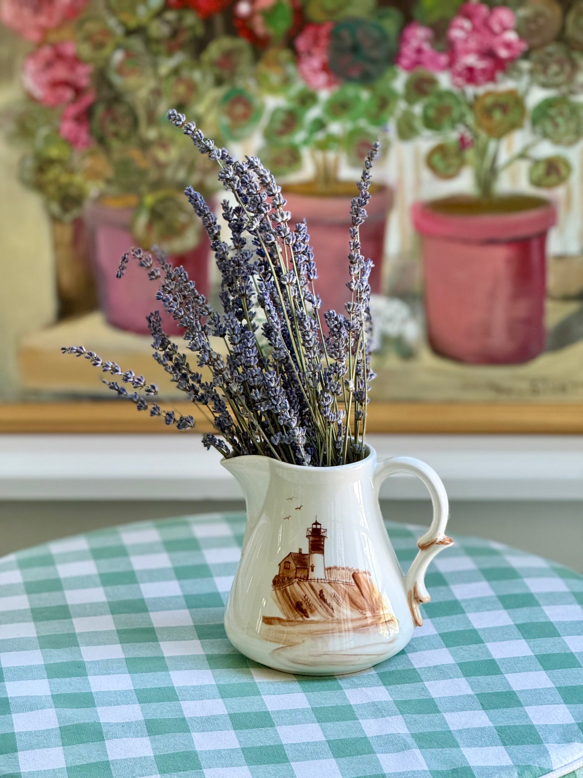 Coastal Grandmother in decor form! Capture the spirit of seaside living with this one-of-a-kind hand-painted jug. It effortlessly highlights the iconic beauty of the Cape Cod coastlines, where it was painted, so perfectly. The vessel itself is in line with antique forms. Signed on the bottom with the artist's initials and place of creation, Eastham (Massachusetts).