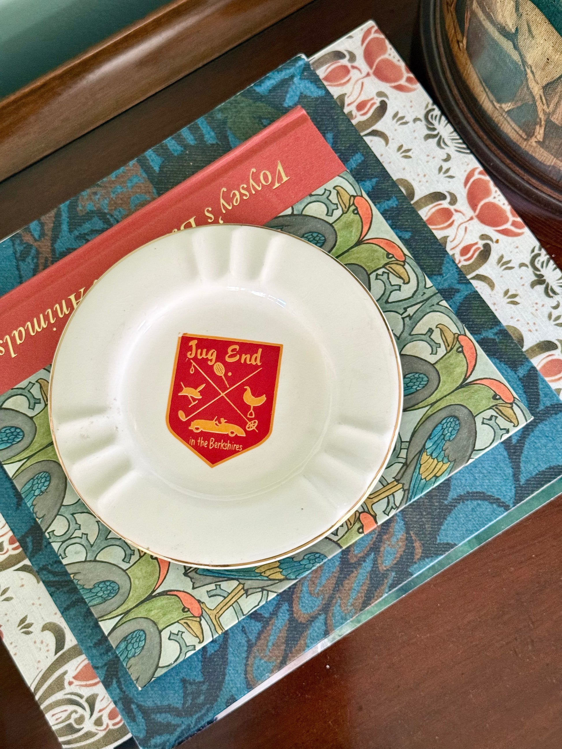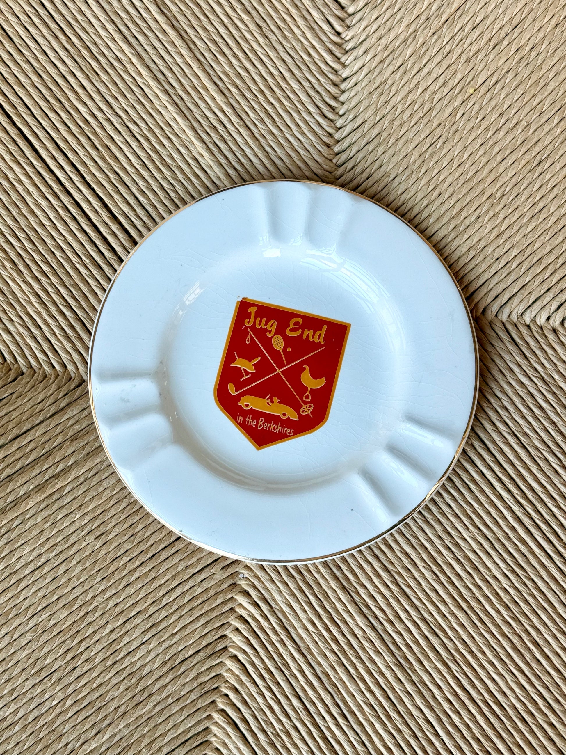 Keep a piece of the Berkshires close with our vintage souvenir ashtray from Jug End in the Berkshires, a resort that was located in Egremont, Massachusetts. Jug End Barn and later Jug End Resort were well-known New England vacation spots from the 1930s through the 1970s, eventually becoming Jug End State Reservation. This keepsake features a jaunty red and gold crest with birds, a ski pole, a tennis racket, and a horseshoe — all symbols of the recreation offered at the resort. Most Jug End souvenir ceramics like this date from around the 1950s–1960s when the resort was at its peak popularity.