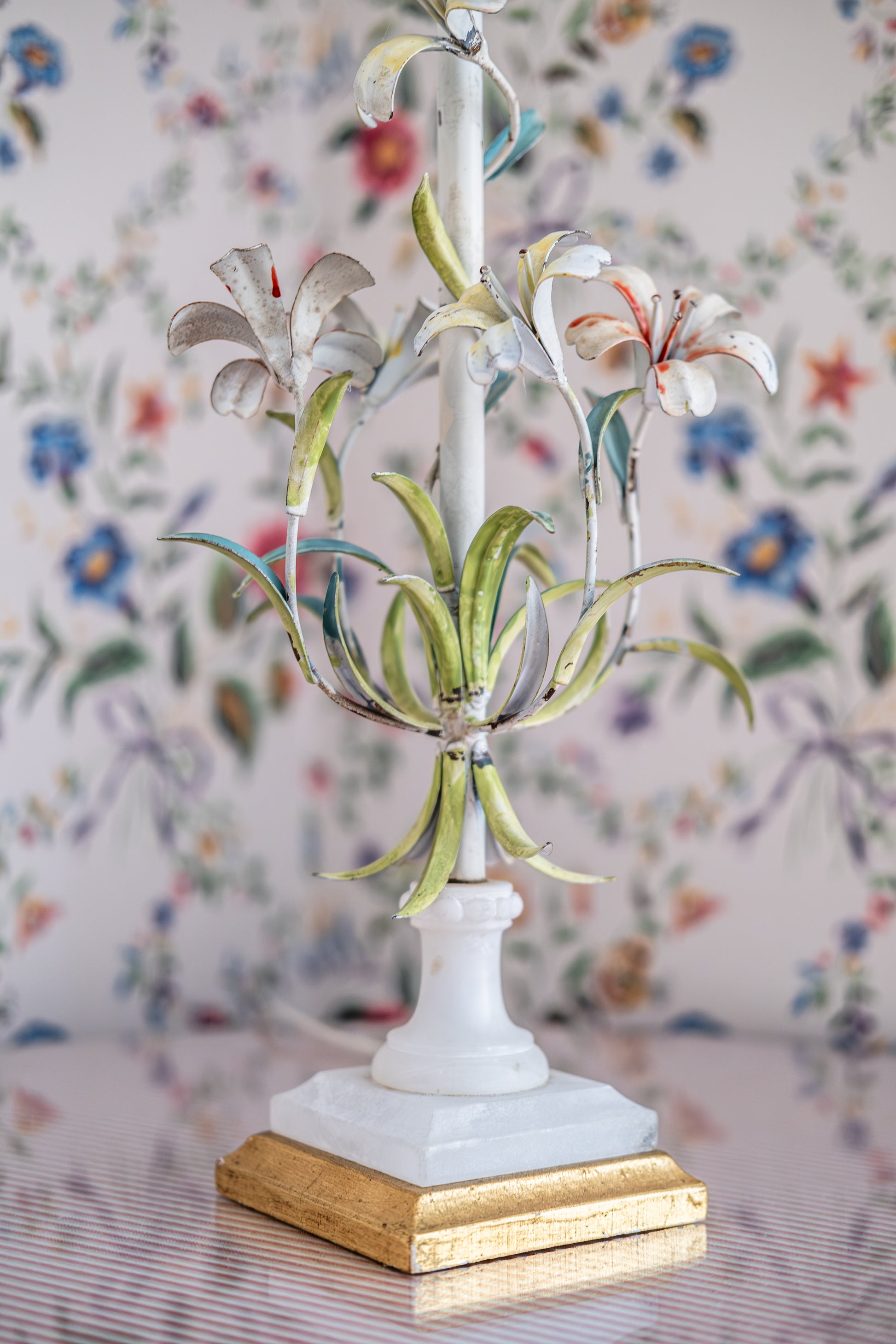 Bring the evergreen allure of a Tuscan garden indoors! Our playful 1960s Italian tole lamp features a sculptural bouquet of hand-painted metal lilies and foliage arranged in softly patinated hues along a slender central stem. The lamp is anchored by a painted base with a gilt accent, lending warmth and contrast to the airy floral composition.