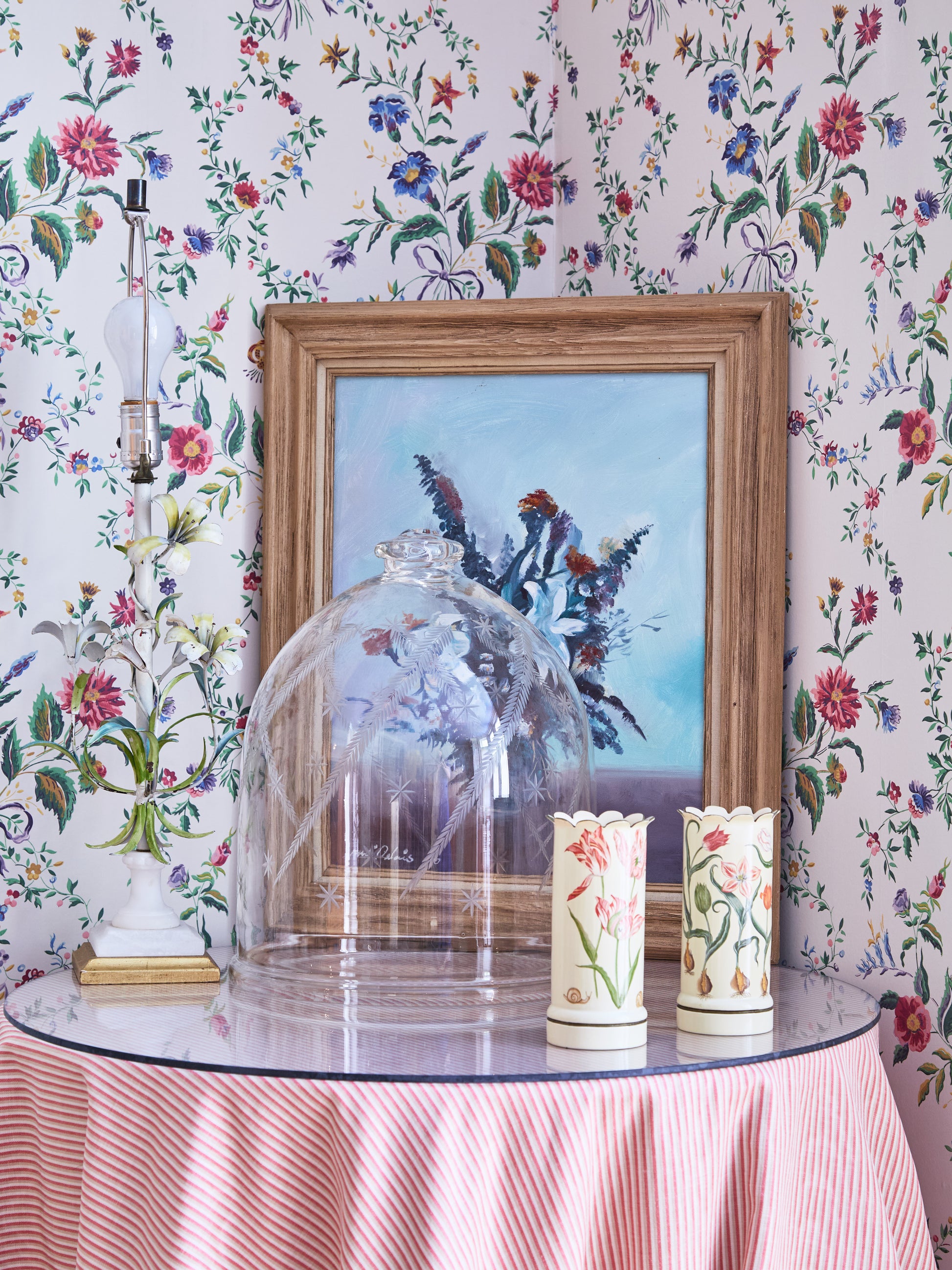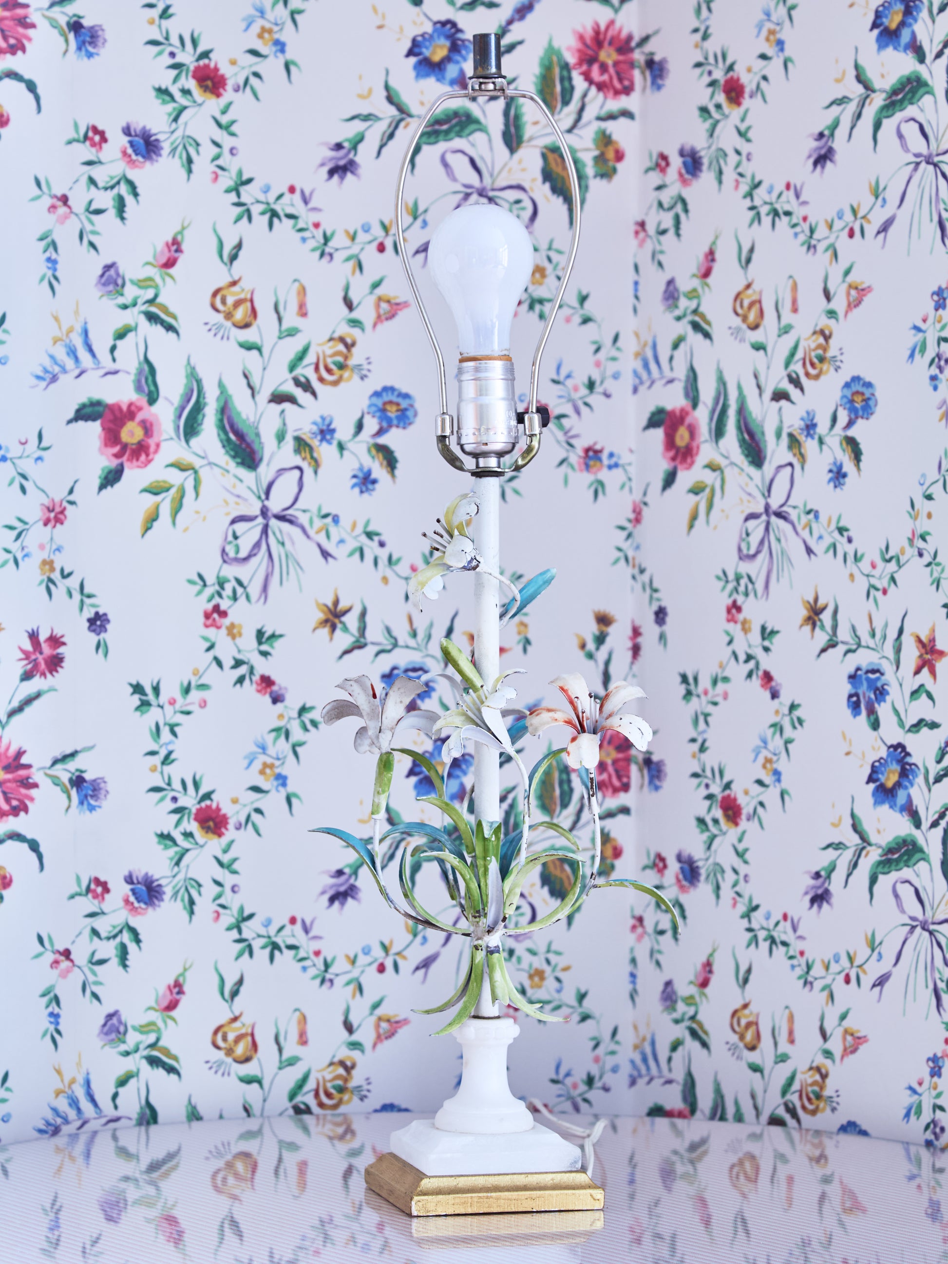 Tole lamps enjoyed renewed popularity in the mid-20th century as decorative lighting shifted toward sculptural, expressive forms. Italian and French makers produced floral and botanical designs in painted metal that brought warmth and ornament to interiors, offering a romantic counterpoint to modernist restraint. These lamps were prized as accent pieces, blending easily with both traditional furnishings and emerging mid-century styles.