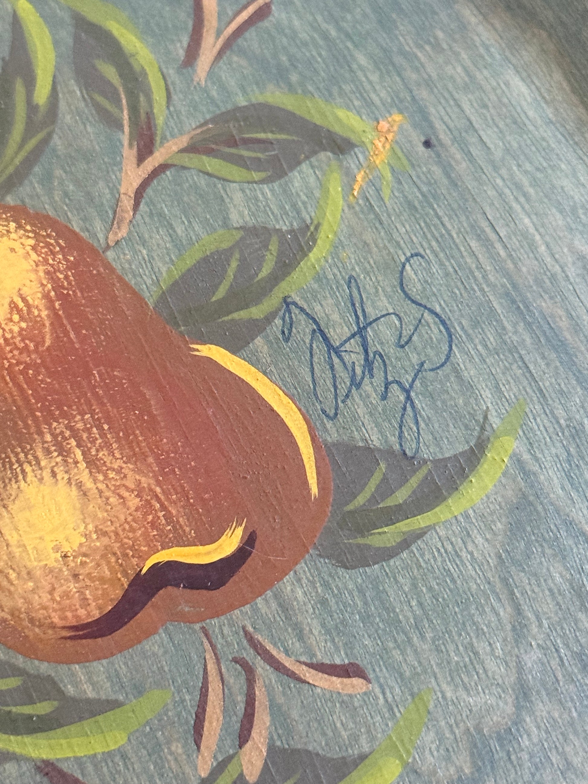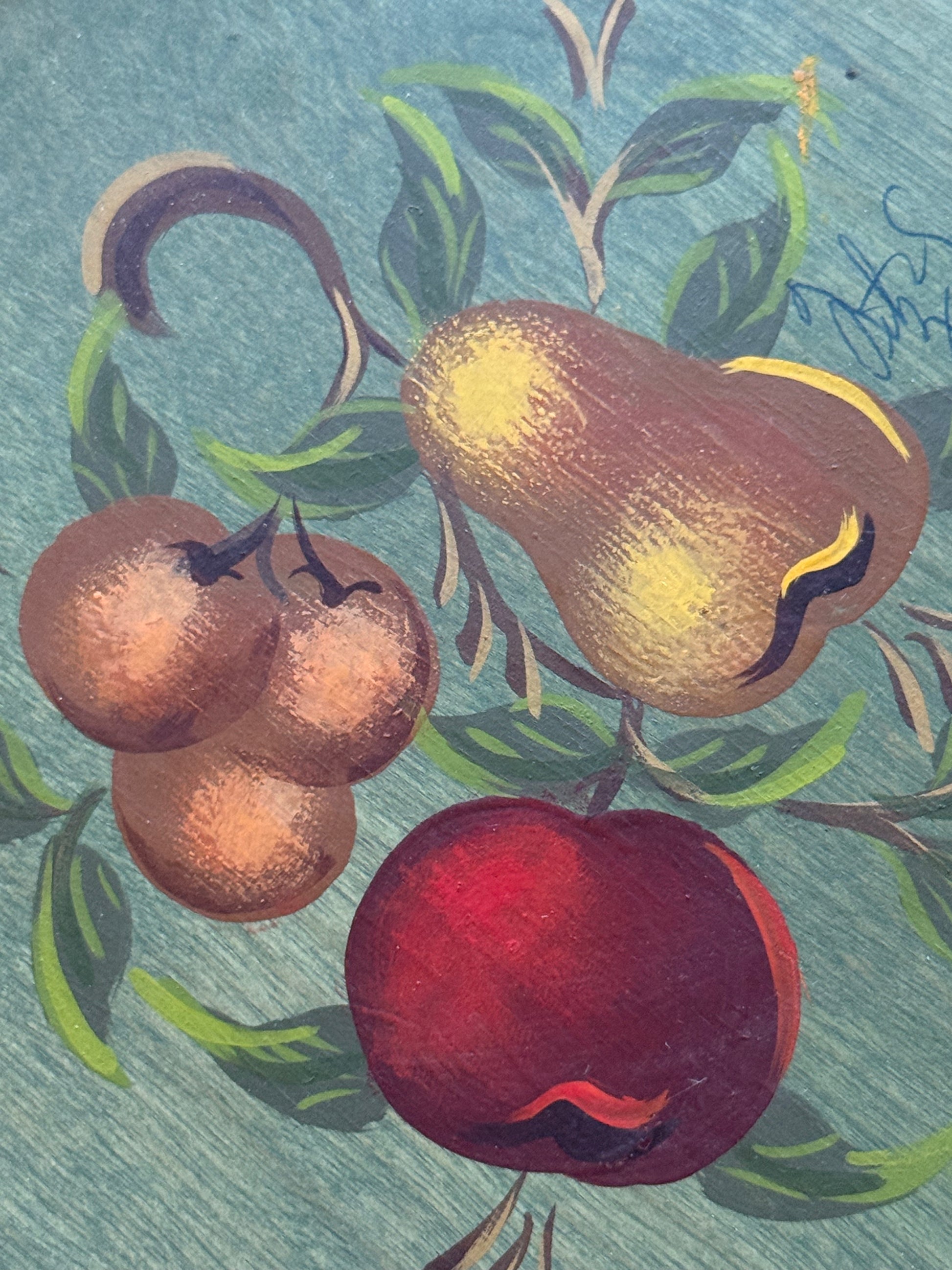This is an original hand-painted decorative plate by the acclaimed Vermont folk artist, Tom FitzSimons (sometimes seen as Fitz-Simons). FitzSimons' work is celebrated for its warm, rustic style and high-quality tole painting on woodenware, often dating from the 1950s to the 1970s. This piece is particularly unique with its luscious sage green and Trompe-l'œil effect. A whimsical piece of mid-century Americana! Signed by the artist.